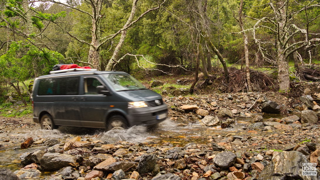 Von der Genna Eragas runter zur Furt Bau Antine ist nur noch ein steiniger, ausgewaschener Bergweg geblieben, gerade breit genug für unseren Bus. Mühsam versuchen wir den großen Steinen auszuweichen und trotzdem in der Spur zu bleiben. Nach der Furt wird es dann für uns brenzlig. Der Weg ist durch den Regen so aufgeweicht, dass sich die Vorderräder immer wieder eingraben. Nur mühsam und mit ausgeschaltetem ESP kommen wir die vielleicht 50 m bis zur ersten Kurve....