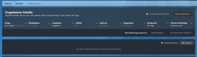 Hallo, Man kann In der Forenübersicht die gewünschten Foren mit dieser Schaltfläche ausblenden. das geht natürlich auch in der mobilen Ansicht. Dann sieht man die Foren, die einen nicht interessieren nicht mehr und es ist dann recht übersichtlich. In der Anzeige "Was ist neu" gibt es hier (auch in der mobilen Ansicht) verschiedene Filtermöglichkeiten: Man kann sich da auch nur bestimmte Foren anzeigen lassen: Wenn man sich einmal ein wenig mit den Filtermöglichkeiten beschäftigt, kann man da sehr gut für den eigenen Bedarf die geeigneten Einstellungen finden. Nein, diese Möglichkeit besteht nicht. Ich schliesse das Thema damit mal ab und wünsche euch ein entspanntes Osterfest. Gruss, Stephan1 Punkt