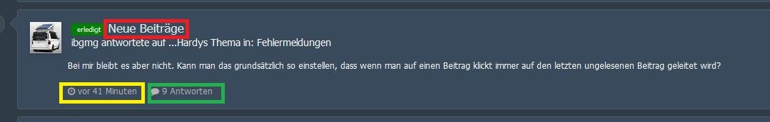 calimerlin Geschrieben 21. Mai 2018 Teilen Geschrieben 21. Mai 2018 Hallo, Wenn man auf den Titel klickt (rote Markierung) kommt man zum ersten Beitrag des Themas. Beim Anklicken des Gelb markierten Bereiches zum letzten Beitrag. Das Klicken auf den hier grün markierten Bereich bringt einen zum ersten ungelesen Beitrag. Gruss, Stephan Zitieren Link zu diesem Kommentar