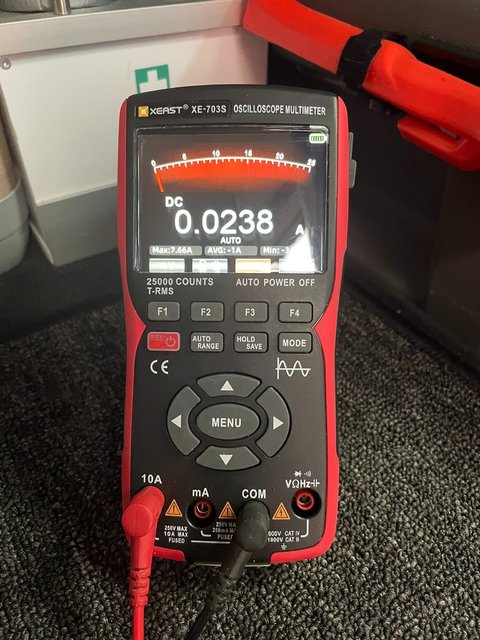 Messung an Zweitbatterie unterm Sitz: Entladestrom zunächst 0.5A, dann runter auf 20mA. Also alles ok.