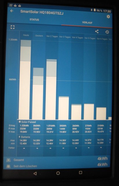 corvus Geschrieben 6. September 2018 Teilen Geschrieben 6. September 2018 (bearbeitet) Grüß Euch So ganz grob kommt das mit 60-70% der angegebenen Wp Leistung schon hin. Hänge zum Vergleich nen Screenshot an. Panel, Offgridtec 100-110 Wp Marine-Solar, am Boden stehend, die meiste Zeit optimal zur Sonne ausgerichtet. Es war das Wochenende 17-19 Aug 2018 sehr heiß. (Völkermarter Stausee Österreich) Die höchste gemessene Oberflächentemp. vom Panel war 78°C. You do not have the required permissions to view the image content in this post. Gruß Knud P. S. Der Faden wäre bei California Elektrik doch besser aufgehoben, oder? Bearbeitet 6. September 2018 von corvus 1 Zitieren Link zu diesem Kommentar