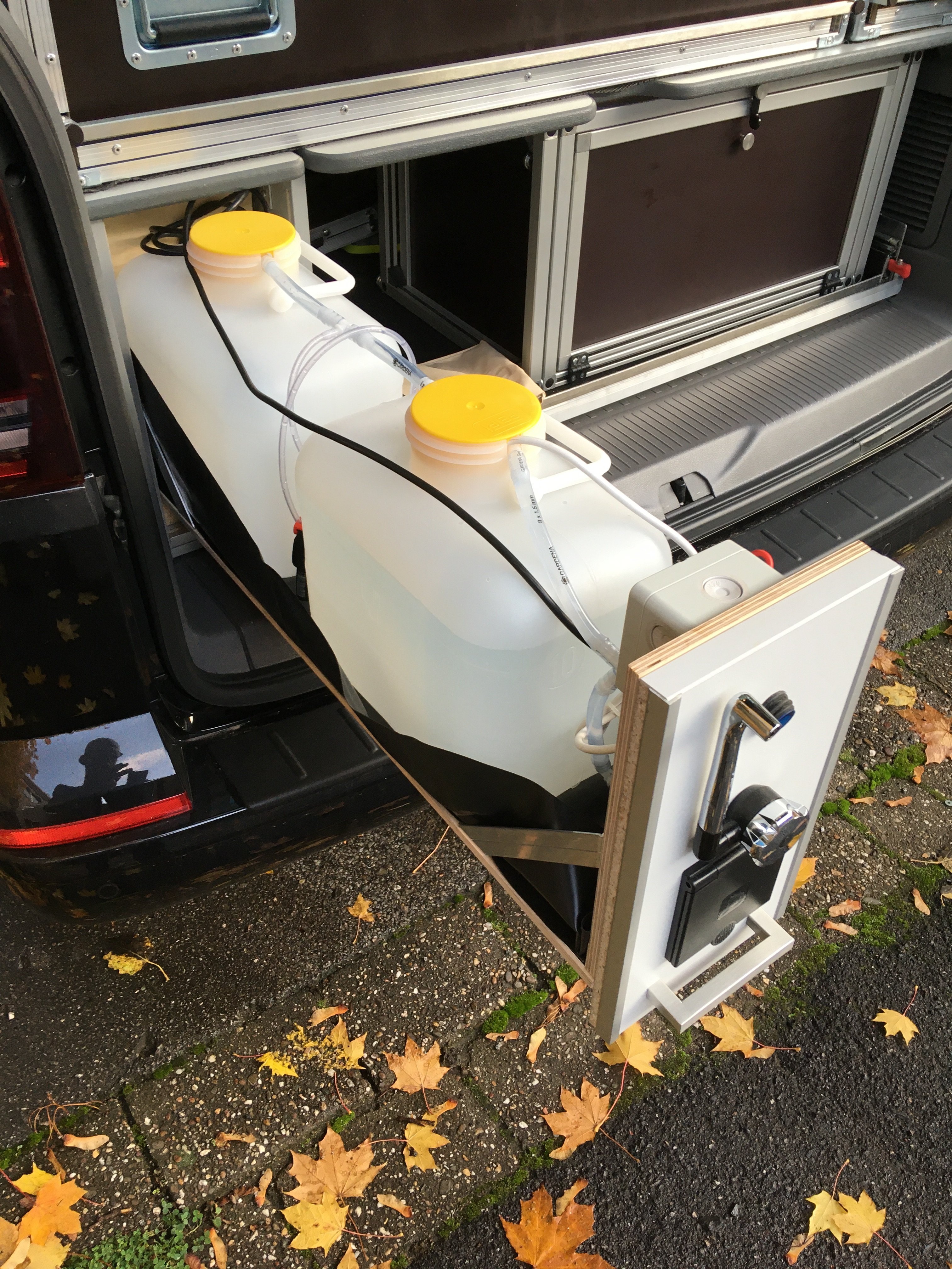Bussolini Geschrieben 26. Oktober 2020 Autor Teilen Geschrieben 26. Oktober 2020 You do not have the required permissions to view the quote content in this post. Hallo Jochen, das ganze System besteht aus 2x 10 Litern Comet Wasserkanister, einer Reich Wassersteckdose, einem Comet Camping Wasserhahn und einer Reich Tauchpumpe 19 l/h mit Entlüftung und Rücklaufventil. Für die Schublade habe ich 700er Teleskopvollauszüge in den Korpus eingebaut. Die 12 V Stromversorgung kommt von der Bordsteckdose , rechts neben meiner 2-er Sitzbank. Das Kabel ist seitlich neben dem Deckel der Staubox eingeführt, da ich ein einklemmen des Kabels oder das Blockieren der Schublade beim Zuschieben vermeiden wollte. Im Falle eines Wasseraustritts (ich traue den vorhandenen Kanisterstopfen nicht…) oder bei Kleckerei beim befüllen, habe ich eine einfache Wanne aus Teichfolie mit Wasserwarnern eingelegt um noch rechtzeitig darauf aufmerksam werden zu können. Eine zweite Tauchpumpe im hinteren Kanister habe ich nicht verbaut, da, im Falle des Ausfalles der vorderen Pumpe es sonst zu einem Überpumpen des vorderen Kanisters kommen könnte. Eine elektrische Verriegelung war mir zu aufwendig, also habe ich das Umpumpen mittels der Schwerkraft und eines Überlaufschlauches gelöst. D. h., wenn sich der vordere Kanister entleert, zieht der im Schlauch entstehende Unterdruck das Wasser des hinteren Kanisters langsam in den vorderen Kanister und füllt diesen dann wieder auf bis beide Füllmengen das gleiche Niveau haben. Ich kann zwar nicht die kompletten 20 Liter bei voller Fördergeschwindigkeit abrufen, aber das brauche ich eigentlich auch nicht. Mir geht’s nur um das Kaffeewasser oder mal die Füße abzubrausen und dafür klappt das ganz gut. LG Bussolini 2 Zitieren Link zu diesem Kommentar