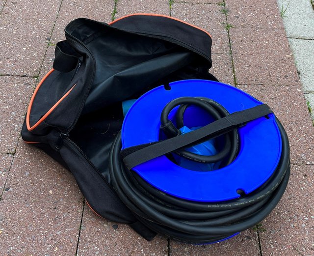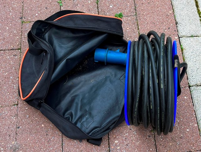 Bei uns fahren zwei Kabel, 25 u. 20m, in den Stühlen in der Heckklappen-Tasche mit. Das passt problemlos. Zusätzlich passt auch noch ein kurzes Adapterkabel CEE auf Schuko mit rein.
