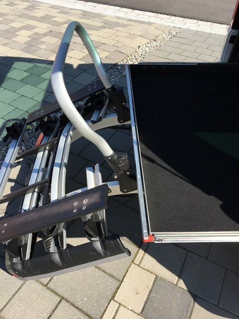 Ich meine, ich hätte mal gelesen, dass das sehr knapp ist und u.a. vom Fahrwerk (Höherlegung, Tieferlegung), Beladungszustand, und Gelände abhängt. Also schon ein leichter "Gegenhang" bedeutet, dass der Träger mit 4. Schiene nicht mehr weit genug runter geht, um die Klappe zu öffnen.