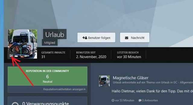 calimerlin Geschrieben 12. November 2021 Online Teilen Geschrieben 12. November 2021 Hallo, Einfach ganz einfach... In deinem Profil dieses kleine Knöpfchen drücken: Dann öffnet sich wie durch Zauberhand das Menu. Da kannst du dann das Bild löschen oder einfach ein neues hochladen: Gruss, Stephan Zitieren Link zu diesem Kommentar