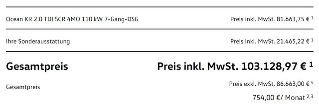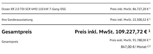 Calimaso Geschrieben 21. September 2022 Teilen Geschrieben 21. September 2022 (bearbeitet) Gestern auch vom Freundlichen mitgeteilt bekommen: 6,8% beim Cali als Basisfahrzeug und 6% auf Sonderausstattung. Zum Jahreswechsel sollen es dann ggf. nochmal 1-3 % werden. Das zerlegt meinen Plan einen "Last Call" zu setzen. Gruss Thomas Bearbeitet 21. September 2022 von hangloose69 Zitieren Link zu diesem Kommentar