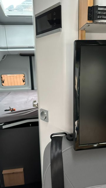 Für die Stromversorgung haben wir von Moritz, Fa. VanXplorer, eine separat abgesicherte 12V-Steckdose in der unteren Ablage einbauen lassen.