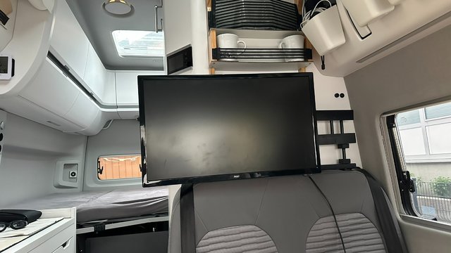 Beim Fernseher handelt es sich um einen 27“ Smart-TV, den es im Frühjahr ’24 für kleines Geld bei Fritz-Berger zu kaufen gab. Er wiegt ca. 4 kg. Das Fernseh-Signal kommt über Internet/Netgear-Box und wir nutzen die ARD- und ZDF-Mediathek. Eine SAT-Anlage haben wir nicht, leider auch keine SAT-Vorbereitung.