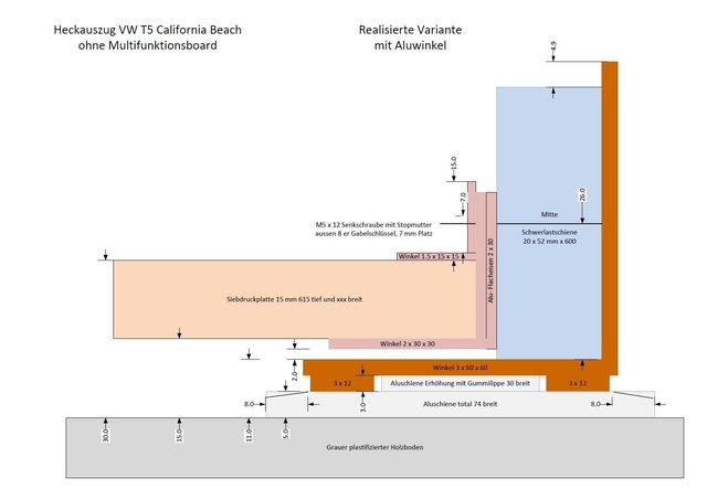 aare07 Geschrieben 14. September 2023 Teilen Geschrieben 14. September 2023 Wir haben sowohl Multiflexboard wie den Heckauszug mit einem Selbstausbau realisiert. Das Multiflexboard haben wir eh immer unpraktisch gefunden und wir wollten einen Heckauszug der wenig Höhe verschenkt. Der MFB Ersatz war aufwändig, der Heckauszug recht einfach zu realisieren. Bilder im Gebrauch hier: Konstruktion: Der Metallrahmen als MFB Ersatz im Eigenbau: - unten Winkel 60x60x3 mm in der gewünschten Länge - daran Vierkantrohr als horizontale Stützen geschweisst - oben mit Flachstahl verschweisst damit es Links unt Rechts einen Rahmen gibt - Vorne und hinten Quer ein Vierkantrohr, angeschraubt mit im Rohr eingeschweissten Muttern - Zwei Holzplatten drauf 6 mm (zwei -> komme notfalls von innen/oben zum Inhalt auf dem Heckauszug) Heckauszug: - an der Auszugs-Siebdruckplatte beidseitig je zwei Aluwinkel befestigt (geklebt und verschraubt) Hinten die Platte mit Aluwinkel verstärkt damit sie weniger durchbiegt und mit Überstand einen Rutschstopp geschaffen - Schwerlastauszüge hatte ich ohne Arretierung, entsprechend die Handmade-Holzarretierungen... Recht Aufwändig selber gemacht beim befreundeten Bauern mit Schweissgerät selbst geschweisst. Ziel war keinen Millimeter Platz (und vor allem Höhe für "Küchenkiste") zu verschwenden und aus 3 er Bank das Bett zu machen ohne das verschieben der Rückbank Auf die obere Holzplatte stelle ich Faltkanu (22Kg) , Wanderzelt, Wander-Campingausrüstung, zwei Kleidertaschen und die Kissen und Duvets darauf. Der Heckauszug trägt klaglos ganze Küche, zwei Campingaz R904 und die gesammten Essensvorräte Funktioniert nach 11 Jahren noch tadellos Viel Spass beim Konstruieren Gruss Aare You do not have the required permissions to view the image content in this post. Zitieren Link zu diesem Kommentar