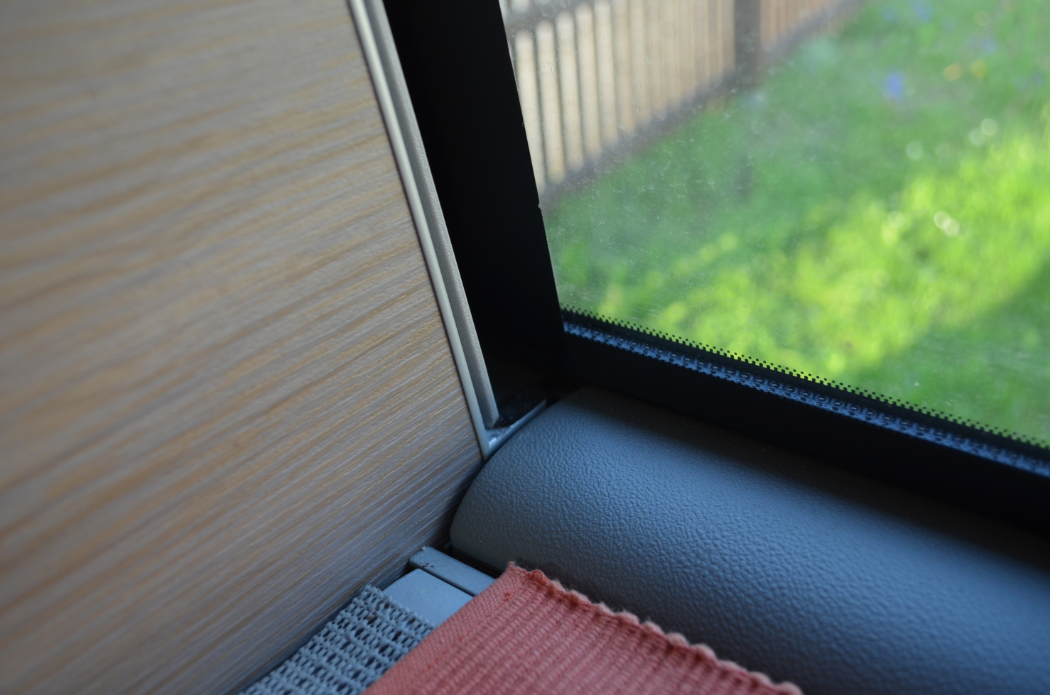 Die Ursache war hinter der Spüle oben im Schrank, dort rieb sich irgend eine hintere Strebe o.ä. gegen die untere Plastik-Verkleidung des Seitenfensters. Das Knarzen war auch verschwunden, wenn man von oben auf die Verkleidung am Übergang zum Schrank gedrückt hat.