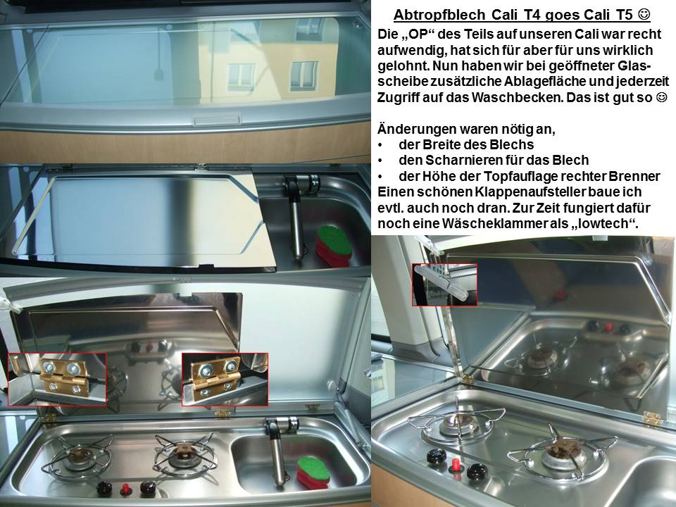 mopedjunkie Geschrieben 21. Februar 2014 Teilen Geschrieben 21. Februar 2014 Hallo Zusmmen, beim Stöbern im Netz bin ich auf den MB Viano Marc Polo "gestolpert". Wollte einfach mal sehen, was der so für Features hat :-) Dabei fiel mir diese clevere Lösung im Bereich der Spüle auf. --> http://www.google.de/imgres?biw=1067&bih=465&tbm=isch&tbnid=Q-BKa7pXeHXKqM%3A&imgrefurl=http%3A%2F%2Fcamping-bus.blogspot.com%2F2012%2F08%2Fviano-fun-marco-polo-edition-auf.html&docid=fkUImmtfo7m_OM&imgurl=http%3A%2F%2F1.bp.blogspot.com%2F-6F_cKq4x-zQ%2FUB7U98Qmx6I%2FAAAAAAAACqg%2Fh12SE_5WXS4%2Fs1600%2FMarco%252BPolo%252Binnen%252B1.jpg&w=1024&h=682&ei=gFIHU7-YMeTV4wTop4HIDw&zoom=1&iact=rc&dur=3132&page=2&start=8&ndsp=12&ved=0CHMQrQMwCg Das würde zwar ganz gut zu diesem Thema passen, aber ich wollte es nicht "sprengen" --> https://www.caliboard.de/showthread.php?584-Glasdeckel-Umbau-von-Spüle-und-Herd Was haltet Ihr von dieser Alternative? So wie ich das sehe, kann man die zweite Platte (Edelstahl) herunter klappen. Sie ist dann Abtropfschale-bzw. blech für den Abwasch, aber sicherlich auch als Ablage geeignet. Damit hätte sie sogar einen Doppelnutzen gegenüber der "Forumslösung". Mich nervt eigentlich immer nur der mangelnde Abstellplatz, wenn die Dinge aus der Kühlbox entnommen und "umsortiert" werden. Dann kann man bspw. das Waschbecken nicht benutzen. Würde man das MB- Feature im Cali haben, würde man die Glasplatte eben immer (auf dem Stellplatz) geöffnet lassen und bei Bedarf diese Edelstahlplatte absenken. Das Waschbecken ist damit ständig einsatzbereit. O.K., der Nachteil wäre, dass die kleine Abstellfläche über dem Waschbecken dann nicht vorhanden wäre... Bin nun echt auf Eure Gedanken, Eingebungen und Ideen gespannt! Gruß Armin Zitieren Link zu diesem Kommentar